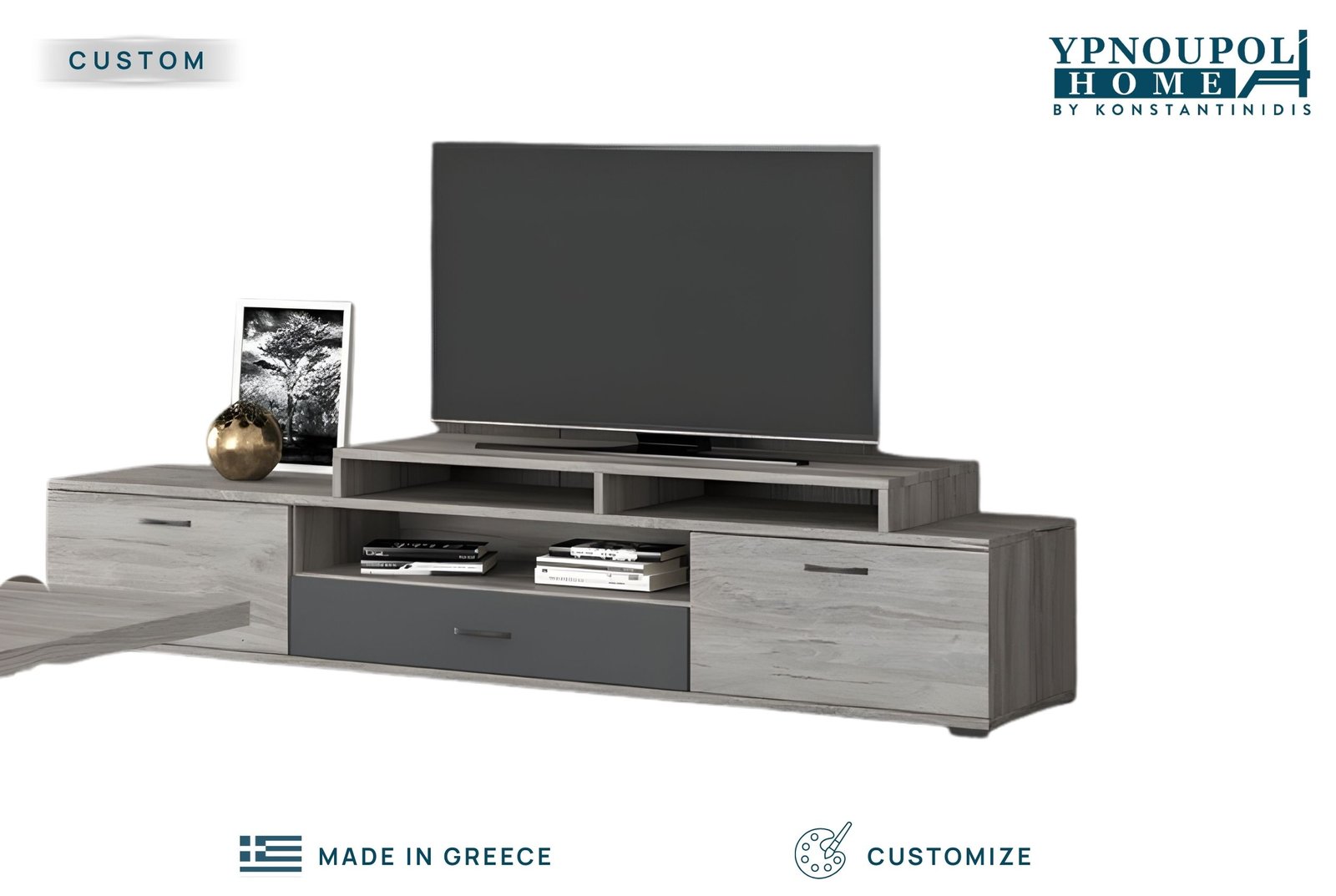 Το έπιπλο τηλεόρασης Amalia αποτελεί μια ολοκληρωμένη πρόταση ελληνικής κατασκευής, που συνδυάζει την πρακτικότητα με τη μοντέρνα αισθητική. Ο σχεδιασμός του βασίζεται σε δύο επίπεδα, προσφέροντας μια δυναμική εμφάνιση και πολλαπλές λύσεις οργάνωσης για τις συσκευές και τα διακοσμητικά σας αντικείμενα. Με στιβαρή δομή και προσεγμένο φινίρισμα, το Amalia είναι μελετημένο για να αναβαθμίσει το καθιστικό σας, προσφέροντας παράλληλα την αντοχή που απαιτεί η καθημερινή χρήση.