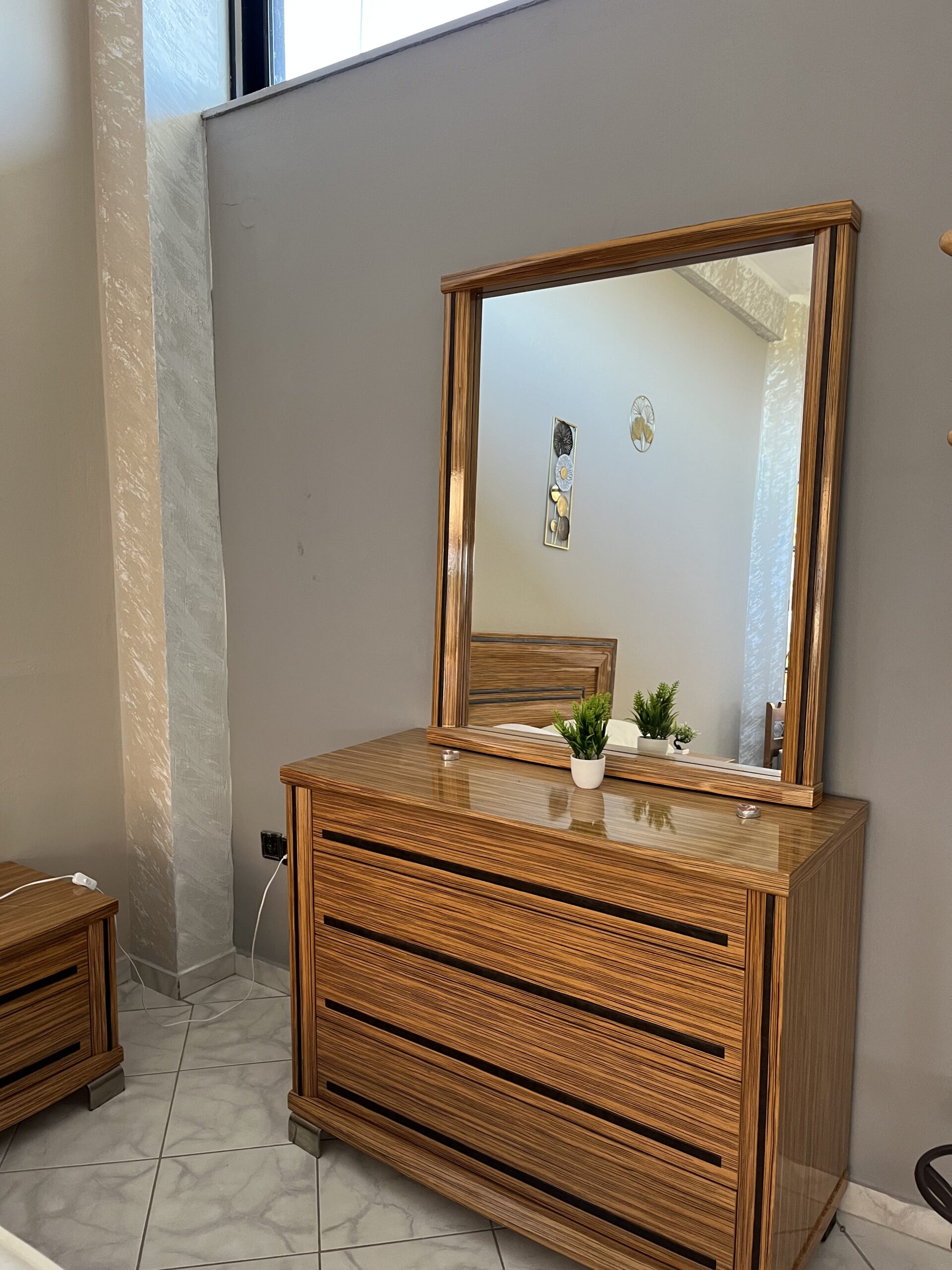 4. Καθρέφτης: Πλαισιωμένος καθρέφτης που ολοκληρώνει το σετ και ενισχύει τον φωτισμό του χώρου.