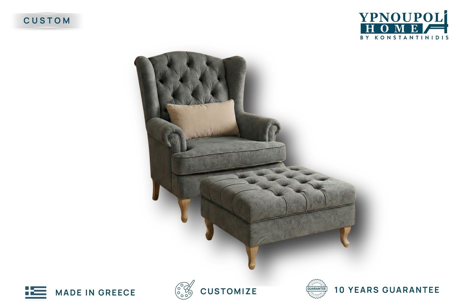 • Σχεδιασμός: Χειροποίητο καπιτονέ φινίρισμα στην πλάτη και το σκαμπό, με κομψά σκαλιστά ξύλινα πόδια.