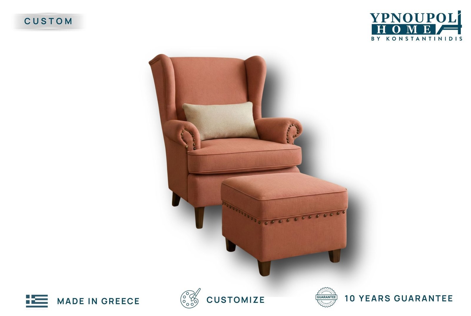 Σύνθεση: Περιλαμβάνει την πολυθρόνα, το υποπόδιο και διακοσμητικό μαξιλάρι μέσης.