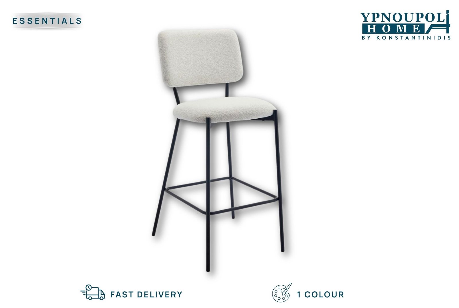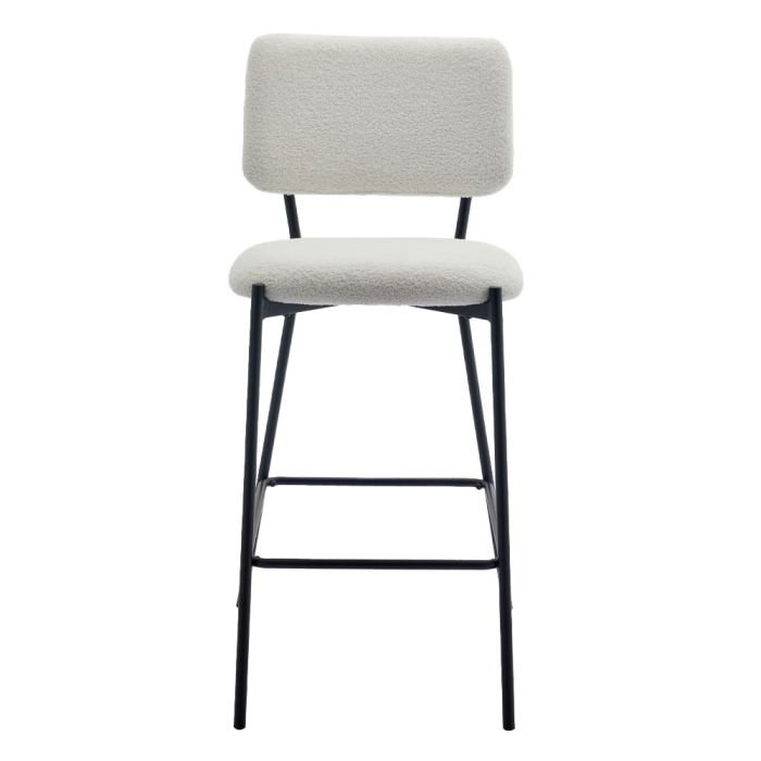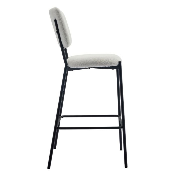 Το σκαμπό Bar Vanera αποτελεί μια μοντέρνα και εξαιρετικά κομψή επιλογή, ιδανική για χώρους που απαιτούν στυλ και υψηλή λειτουργικότητα. Το κύριο χαρακτηριστικό του είναι η επένδυση από πολυτελές ύφασμα μπουκλέ σε καθαρή λευκή απόχρωση, το οποίο προσφέρει μια μοναδική αίσθηση απαλότητας και ζεστασιάς. Ο συνδυασμός της “αφράτης” υφής του καθίσματος με τον αυστηρό μαύρο μεταλλικό σκελετό δημιουργεί ένα έπιπλο με έντονη σχεδιαστική ταυτότητα, κατάλληλο για κάθε σύγχρονο μπαρ ή κουζίνα.