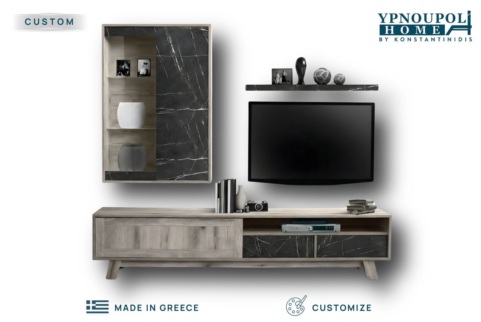 • Σύνθεση: Περιλαμβάνει χαμηλή βάση τηλεόρασης, κρεμαστή βιτρίνα και μίνιμαλ ράφι τοίχου.