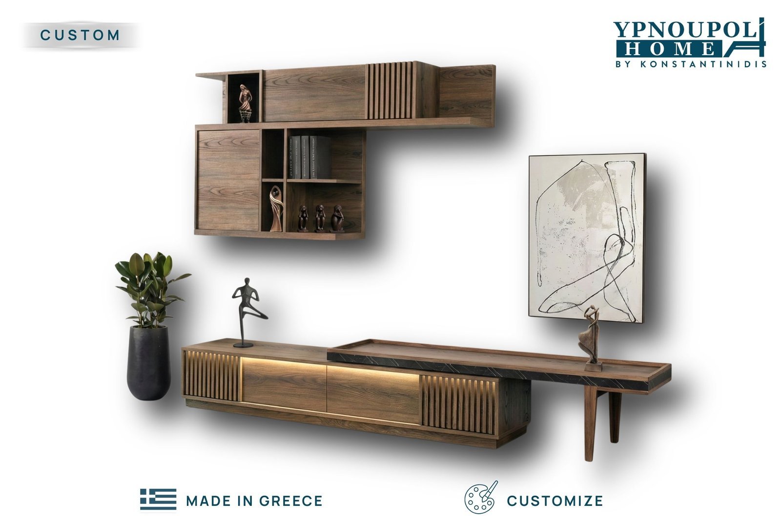 Το σύνθετο σαλονιού Kimi αποτελεί μια εκλεπτυσμένη πρόταση σύγχρονου design, όπου η φυσική πολυτέλεια του ξύλου συναντά την αρχιτεκτονική λεπτομέρεια. Η σύνθεση χαρακτηρίζεται από έναν δυναμικό σχεδιασμό με κάθετες ραβδώσεις (fluted details), οι οποίες προσδίδουν ρυθμό και βάθος στο σύνολο. Η βάση τηλεόρασης εντυπωσιάζει με τον κρυφό LED φωτισμό που αναδεικνύει τις υφές των υλικών, ενώ η επέκταση με την επιφάνεια σε όψη μαύρου μαρμάρου προσθέτει μια νότα απαράμιλλης κομψότητας. Το κρεμαστό σύστημα ραφιών και ντουλαπιών προσφέρει μια πολυεπίπεδη λύση αποθήκευσης και προβολής, δημιουργώντας έναν τοίχο-κόσμημα για το καθιστικό σας. Ελληνικής σχεδίασης και κατασκευής, το Kimi είναι η ιδανική επιλογή για όσους αναζητούν την απόλυτη ισορροπία ανάμεσα στην υψηλή αισθητική και τη λειτουργική υπεροχή.