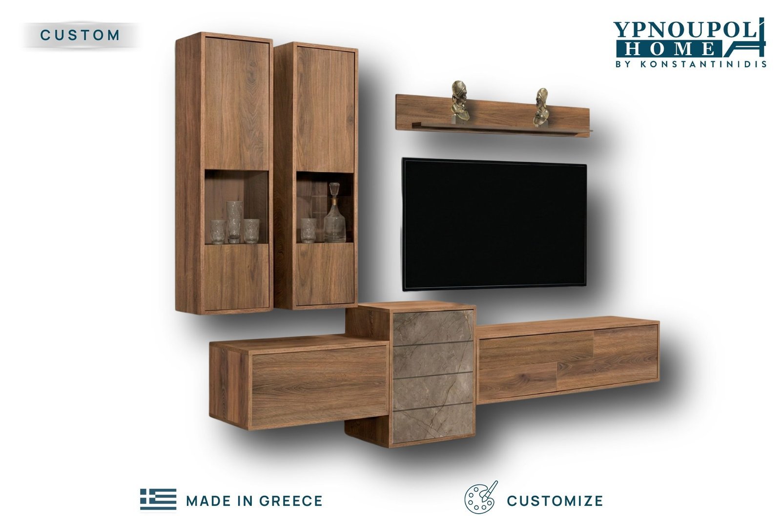 Το σύνθετο σαλονιού Tactile αποτελεί μια αρχιτεκτονική προσέγγιση στη σύγχρονη οργάνωση του καθιστικού, όπου η φυσική υφή του ξύλου συναντά την εκλεπτυσμένη αισθητική του μαρμάρου. Ο σχεδιασμός του βασίζεται σε ένα δυναμικό παιχνίδι όγκων και επιπέδων, προσφέροντας μια πολυδιάστατη λύση αποθήκευσης και προβολής. Οι κάθετες κρεμαστές στήλες με τα ανοιχτά στοιχεία προσθέτουν ύψος και κομψότητα, ενώ η κεντρική μονάδα βάσης με τη μαρμάρινη λεπτομέρεια λειτουργεί ως το αισθητικό επίκεντρο της σύνθεσης. Ελληνικής κατασκευής, το Tactile είναι σχεδιασμένο για να προσφέρει μια αίσθηση στιβαρότητας και υψηλής αισθητικής, μεταμορφώνοντας τον τοίχο του σαλονιού σας σε μια γκαλερί σύγχρονου design.